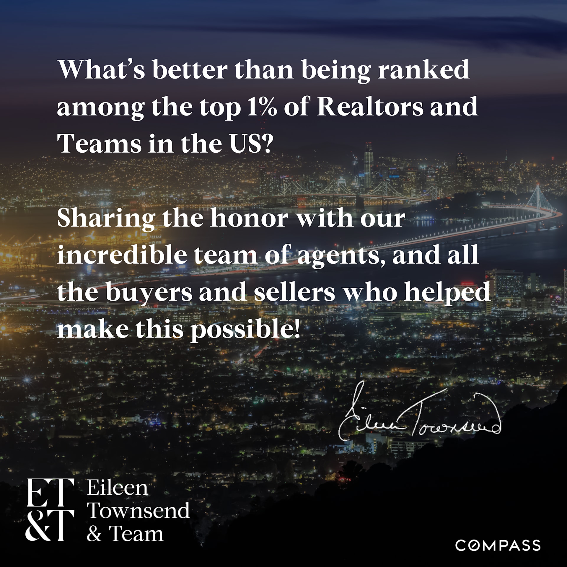 We are proud to announce that Eileen Townsend & Team has been recognized in the RealTrends / Tom Ferry “America’s Best” rankings for the third consecutive year, as published in The Wall Street Journal. This achievement highlights our dedication to our clients and our determination to deliver the best service in the challenging Bay Area real estate market.