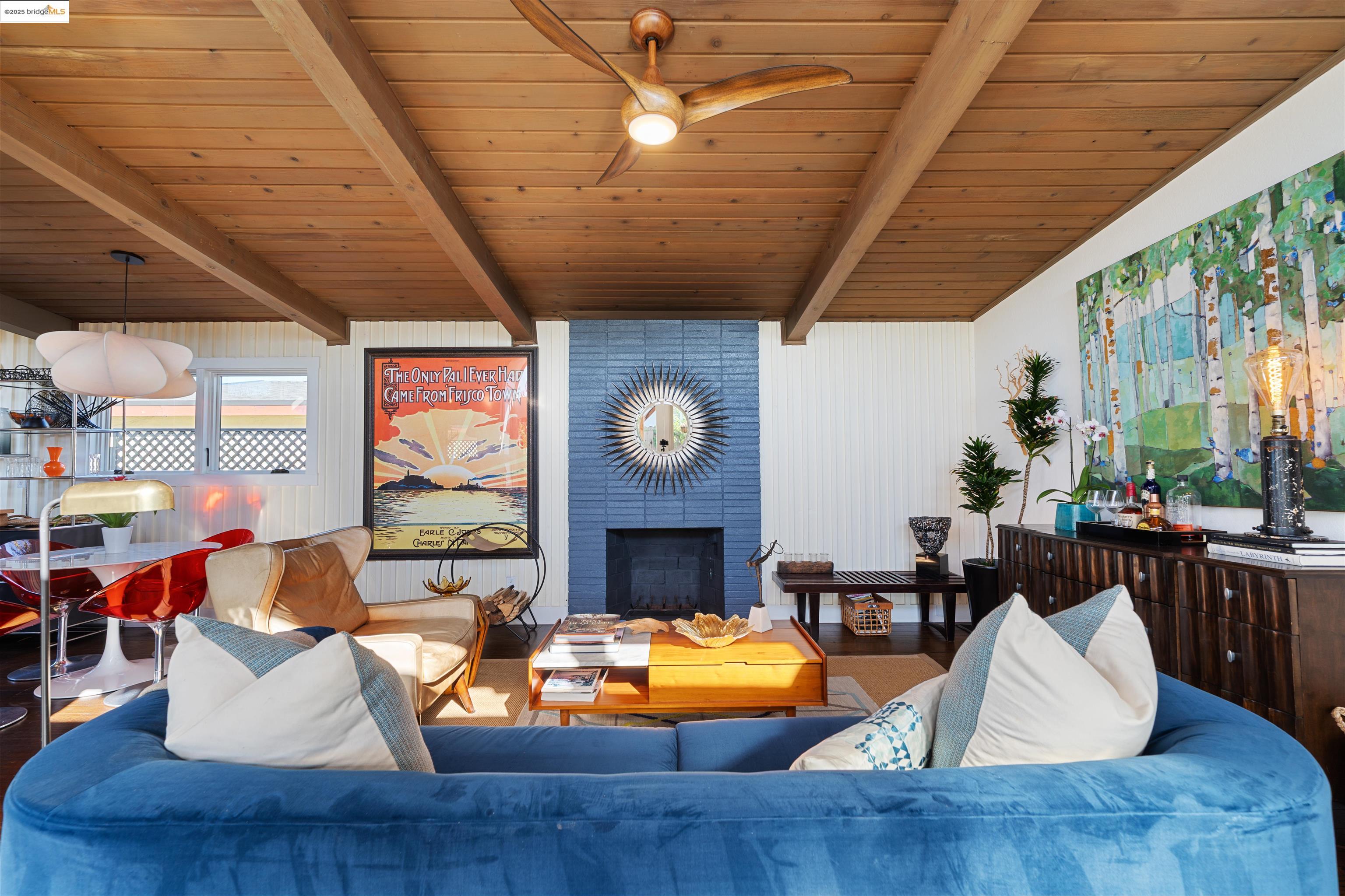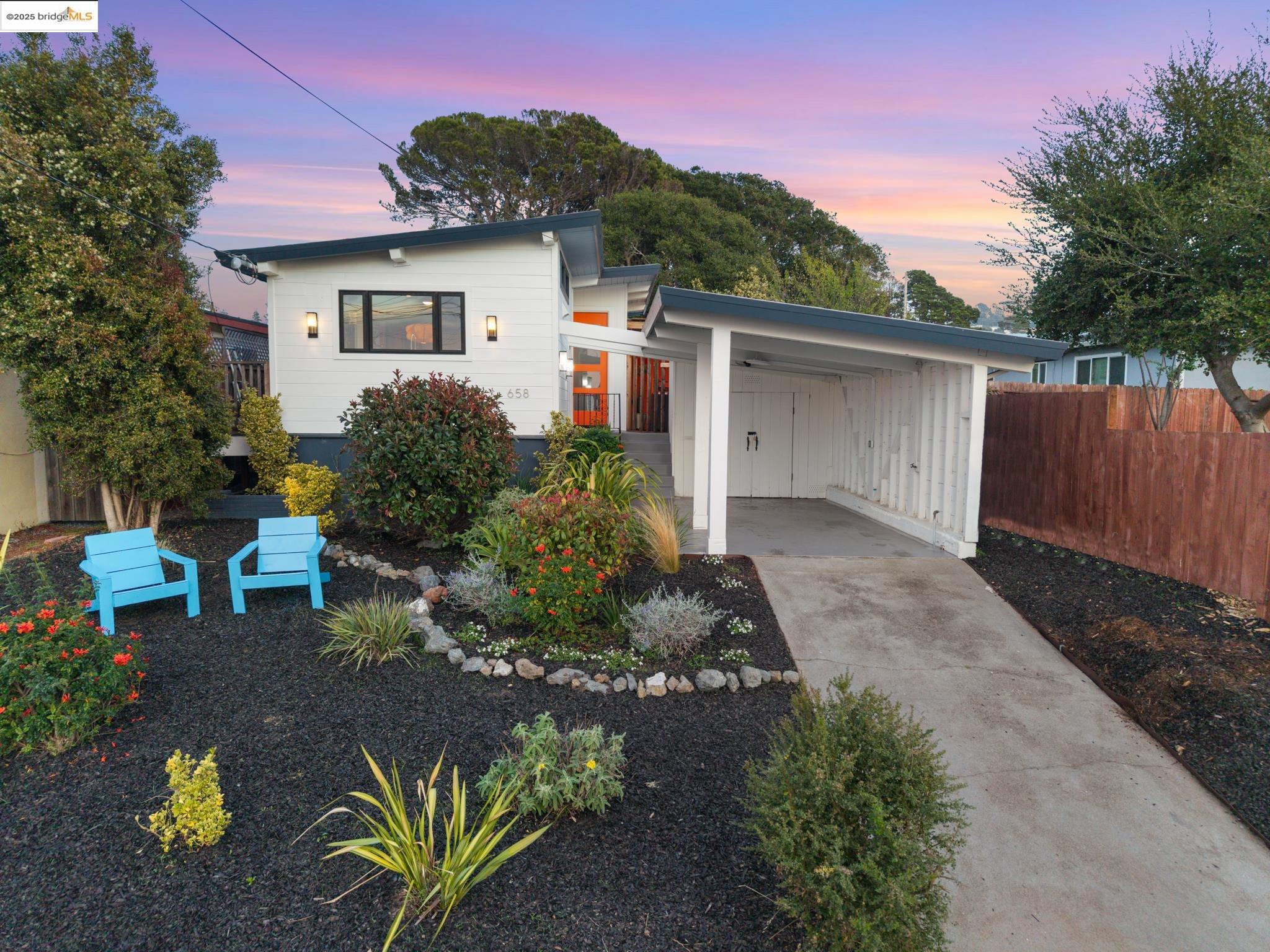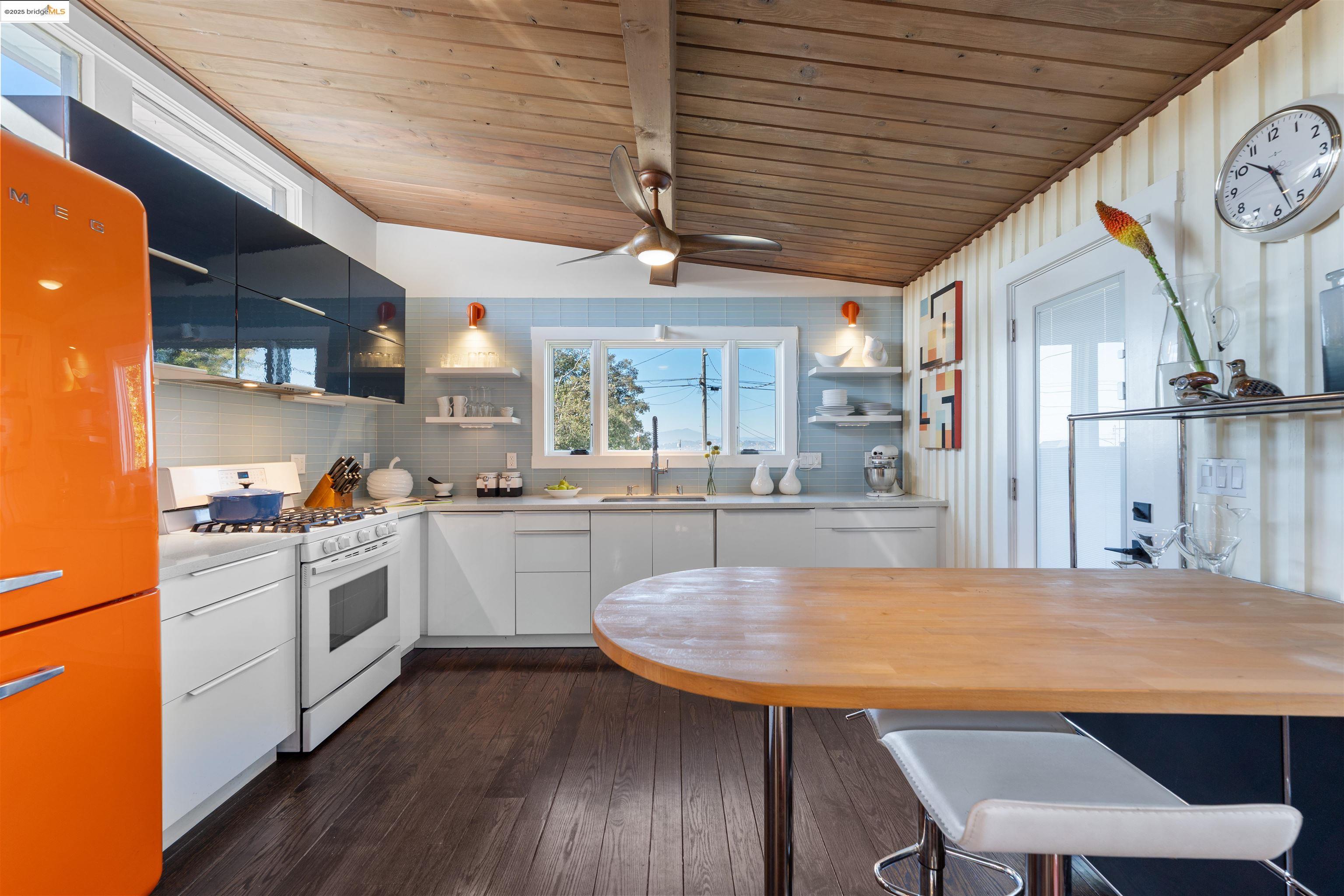 Sharp Mid-Century to-the-studs remodel with Bay/City views, mostly level yard, fantastic indoor-outdoor flow, and Style (with a capital "S"). Step in to the open concept living-dining-kitchen with vaulted wood-beam ceilings. Step right back outside through full-glass living room doors to the outdoor kitchen/covered patio, through a kitchen door to a side deck for grilling, or through french doors opening bedrooms to the backyard. Owned and remodeled by a local designer, standout accents range from the Smeg refrigerator in Golden Gate orange, to Euro-modern soft-close cabinets, to the walk-in pantry and 60s-inspired lighting. Custom tiled remodeled bath is on your way back to 3 main-floor bedrooms. The yard is replete with flowing fountain for zen moments, a classic chiminea for roasting marshmallows, and an authentic red-yellow In-n-Out picnic table. New within the past 5 years: all appliances, exterior doors and dual-pane windows (Anderson and Marvin), furnace, tankless water heater and roof. Washer/drier included and most furnishings and accents are available for purchase. Carport with shed-- perfect for a small workshop. Move into your dream home for the holidays!!